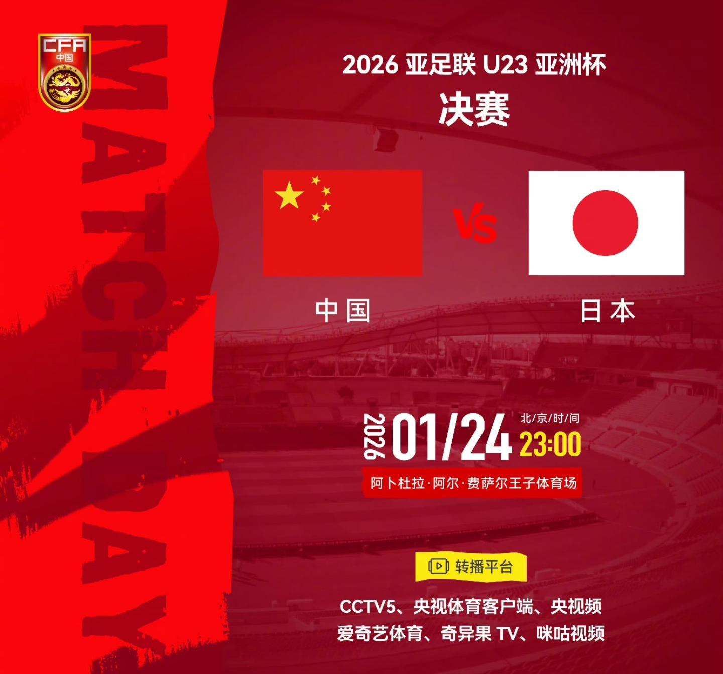 北京时间2026年1月24日消息。今天晚上11点,U23亚洲杯就将迎来决赛,中国队VS日本。目前已经知道,CCTV5直播,并且在网络平台上,詹俊老师也将解说本场比赛。